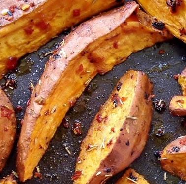 Geroosterde zoete aardappelpartjes met zwarte knoflook, chili en rozemarijn. Uniek en zacht van smaak, smeuïg van textuur.
